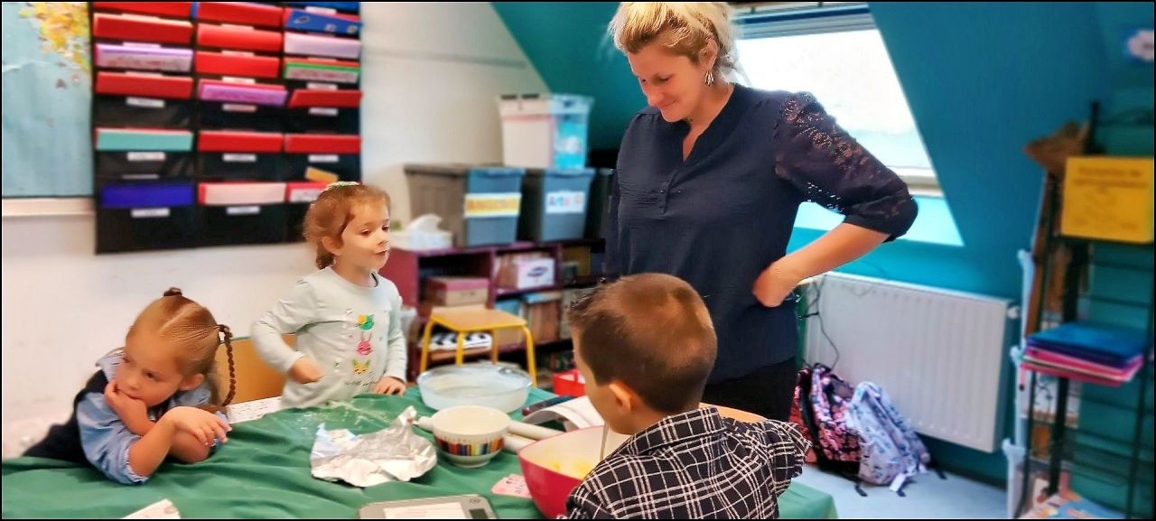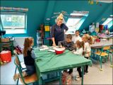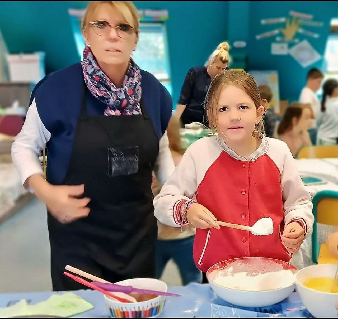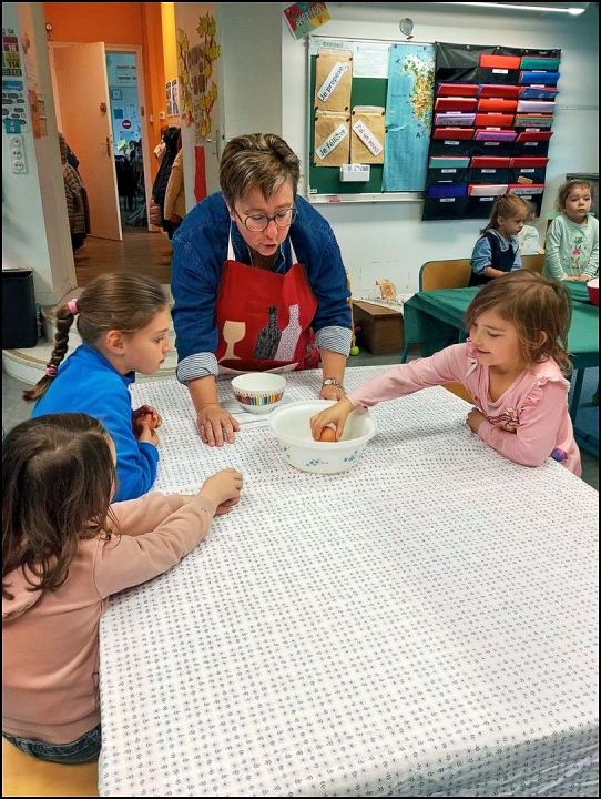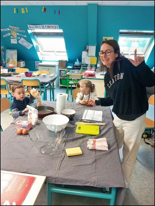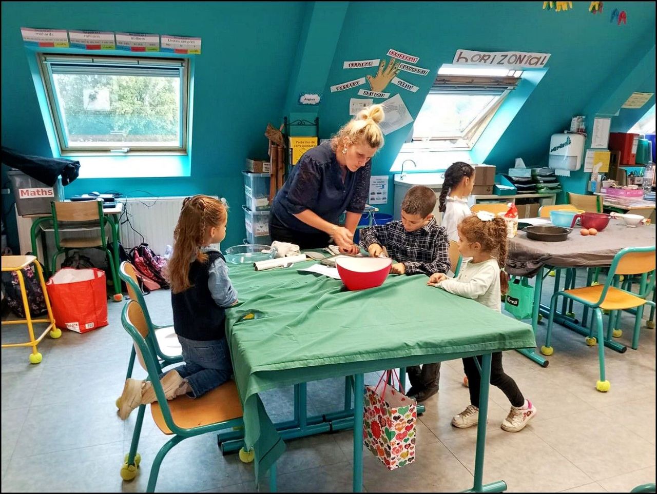 Sous l’œil bienveillant de Cindy, Sandrine, Émilie, Marie-Pierre, bénévoles et de Anne, la séance culinaire a eu lieu dans la classe des CM2. Les jeunes cuisiniers et cuisinières ont mis la main à la pâte en réalisant un quatre-quarts breton, en lien avec l’étude du patrimoine local.